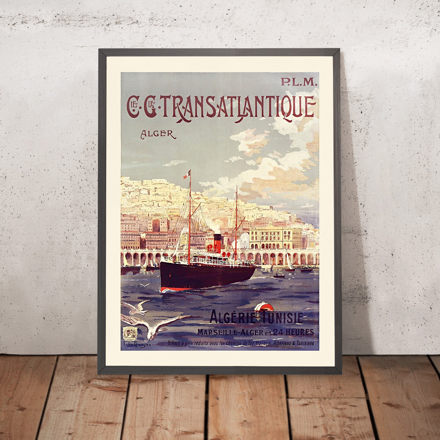 Cie. Gle Transatlantique, Alger by Fernand Le Quesne (1901) is a luminous Belle Époque travel poster inviting the viewer across the Mediterranean to Algiers. Created for the Compagnie Générale Transatlantique in collaboration with the P.L.M. railway, the design celebrates the speed and romance of turn‑of‑the‑century travel. In the image, a black‑hulled liner with a single red funnel glides into a deep blue harbor, gulls skimming the whitecaps in the foreground while Algiers rises behind in sun‑bleached tiers and graceful seaside arcades. The poster’s hand‑lettered notes “Algérie Tunisie” and “Marseille–Alger en 24 Heures” evoke the era’s streamlined connections between France and North Africa.