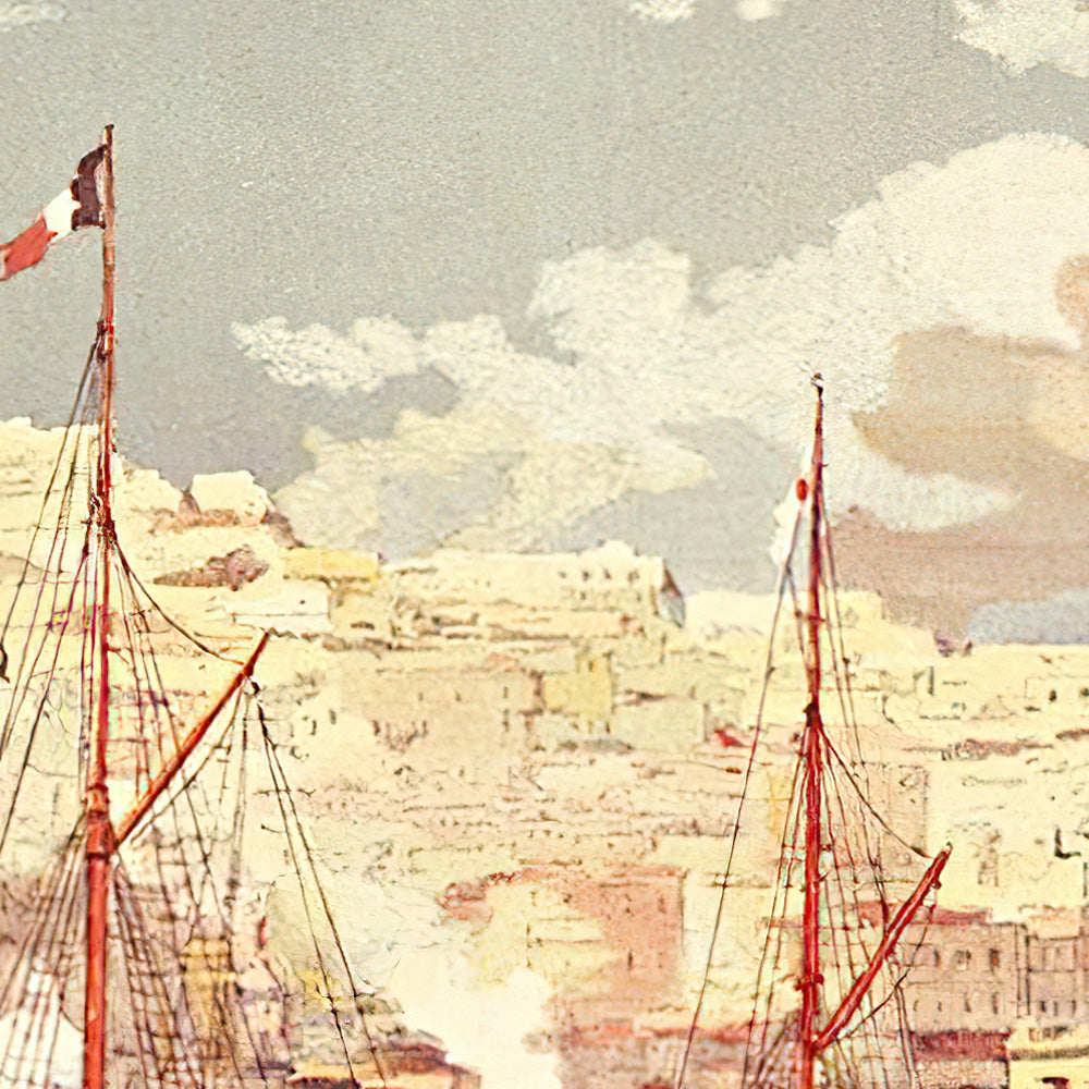 The subject is Algiers at the dawn of the 20th century—a city nicknamed “la Blanche” for its sunlit, chalk‑colored hillsides. Le Quesne captures its distinctive waterfront with the long rhythm of white arcades and the cascade of hillside dwellings stepping up from the port. The ship’s poised arrival places the viewer mid‑voyage, underscoring the poster’s promise of swift passage from Marseille to Algiers within a day, a marvel of its time.