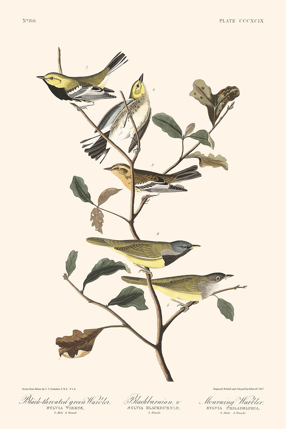 Black-throated green Warbler, Blackburnian, Mourning Warbler by John James Audubon, 1827