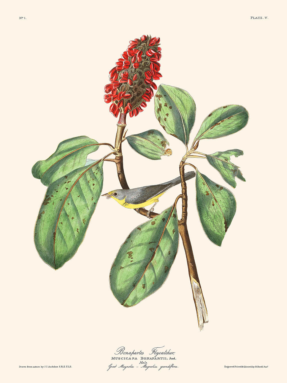 Bonaparte's Flycatcher (Plate 5), first published by John James Audubon in 1827, is a fascinating and rare gem from his monumental work, Birds of America. This intricate illustration brings to life the elusive Bonaparte's Flycatcher, capturing its unique colors and behavior. Audubon named this bird after the distinguished naturalist Charles Lucien Bonaparte, despite having limited information on the bird's habits due to having only encountered it once.