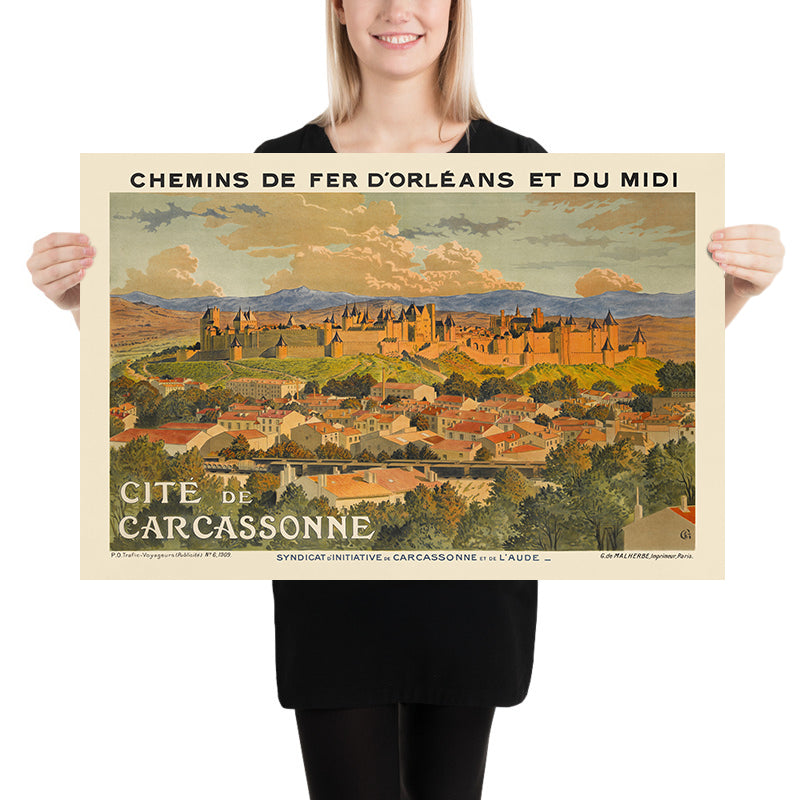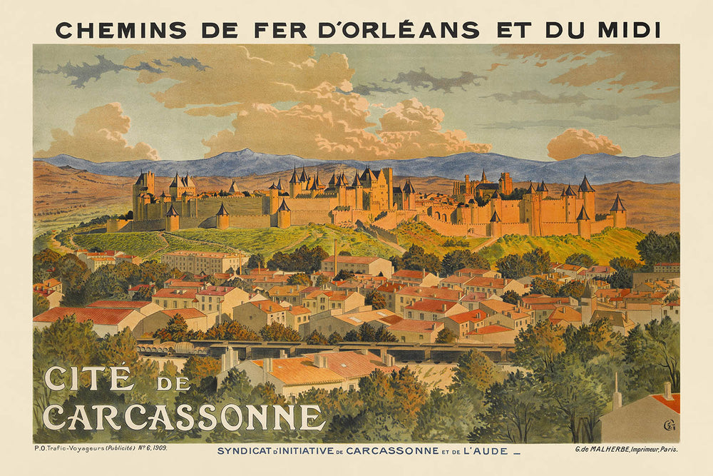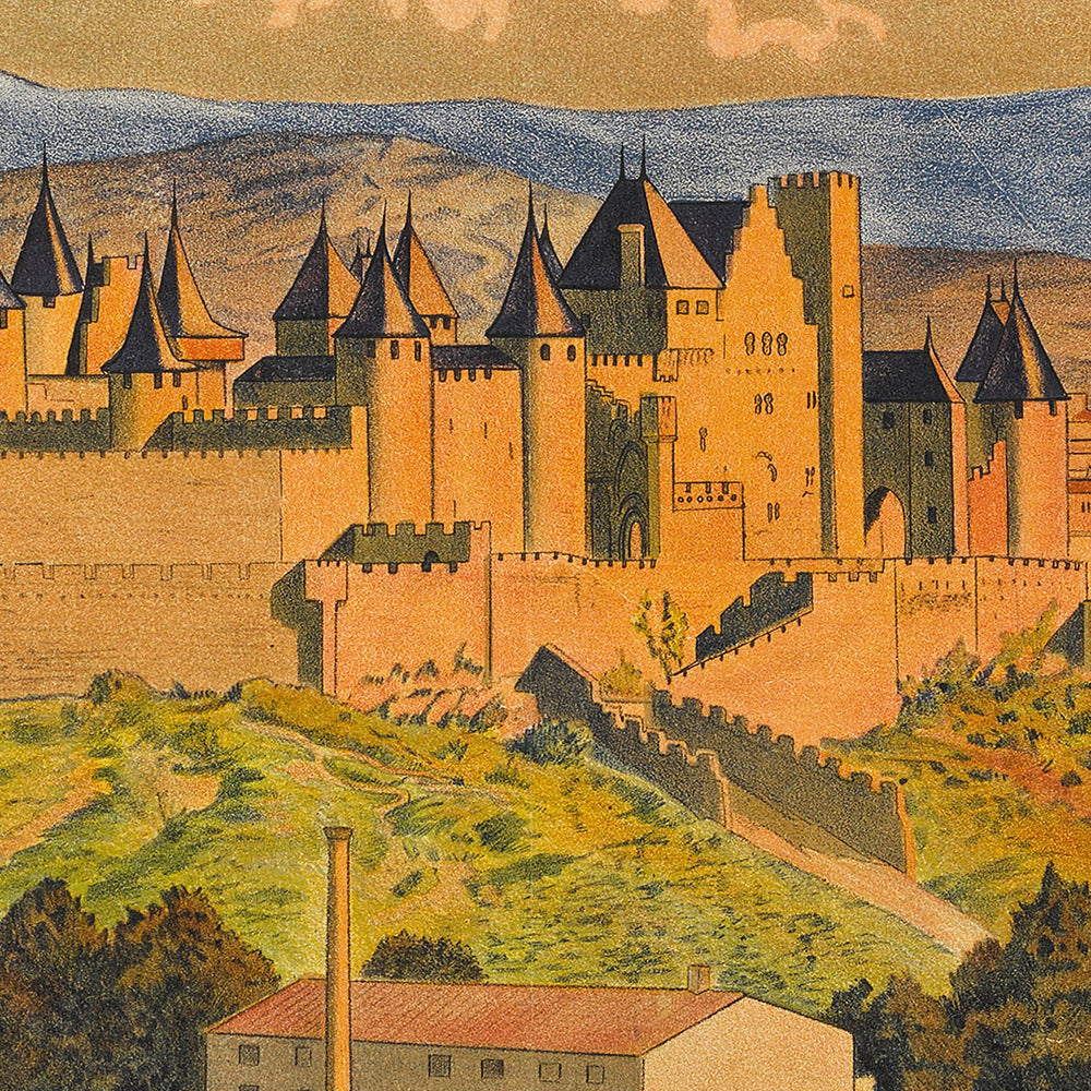 Carcassonne itself is a subject of legend: a medieval stronghold in Occitanie with two concentric walls and dozens of towers, extensively restored in the 19th century and now celebrated as one of Europe’s great fortified skylines. Travelers are drawn to its winding lanes, Roman and medieval layers, and dramatic views over the Aude—exactly the romance early 20th-century tourism posters promised. This image gives you that atmosphere in a single glance.