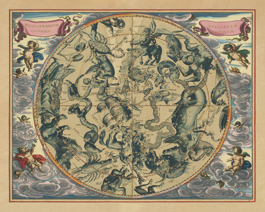 This celestial map is especially captivating due to its historical context. The Southern Hemisphere constellations had only recently been observed and recorded by European scholars in the late 16th century. Cellarius's inclusion of these newly discovered constellations makes the chart not only a beautiful piece of art but also a snapshot of astronomical exploration and discovery in the Age of Exploration.