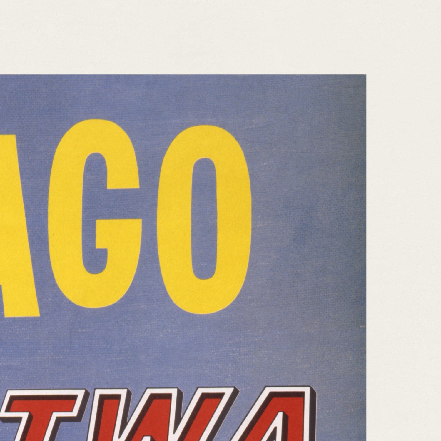 This Chicago poster is a standout of the TWA series from the peak of jet travel. It evokes the city just as O’Hare was rising to global prominence, selling not only a destination but an idea: sleek, swift access to America’s great metropolis of architecture, commerce, and culture. The stacked river bridges are an unmistakable nod to the city’s engineering heritage, while the headline type shouts with the confidence of the era.