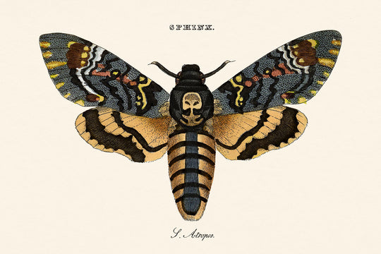 "Death's Head Hawkmoth" by William Wood, first published in 1821, is a stunning and intricate Victorian zoological illustration. This beautiful and highly detailed depiction of the Death's Head Hawkmoth captures the essence of 19th-century scientific artistry.