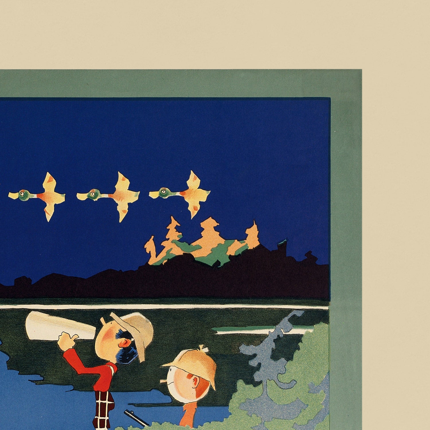 Design and color: Held’s palette of pine green, midnight and lake blues, and warm beige grounds the poster in woods and water, while precise accents—like the crimson lure skimming the ripples and the red shadowing of the title—spark energy. Delightful details reward a closer look: the portager’s plaid trousers, the birch trunks banded with ink‑dark rings, the watchful rabbits at the forest edge, and the clear cameos of a moose (Alces alces) and Canada geese (Branta canadensis). The composition reads like a storybook itinerary, making it a standout piece for a living room, study, or cabin.