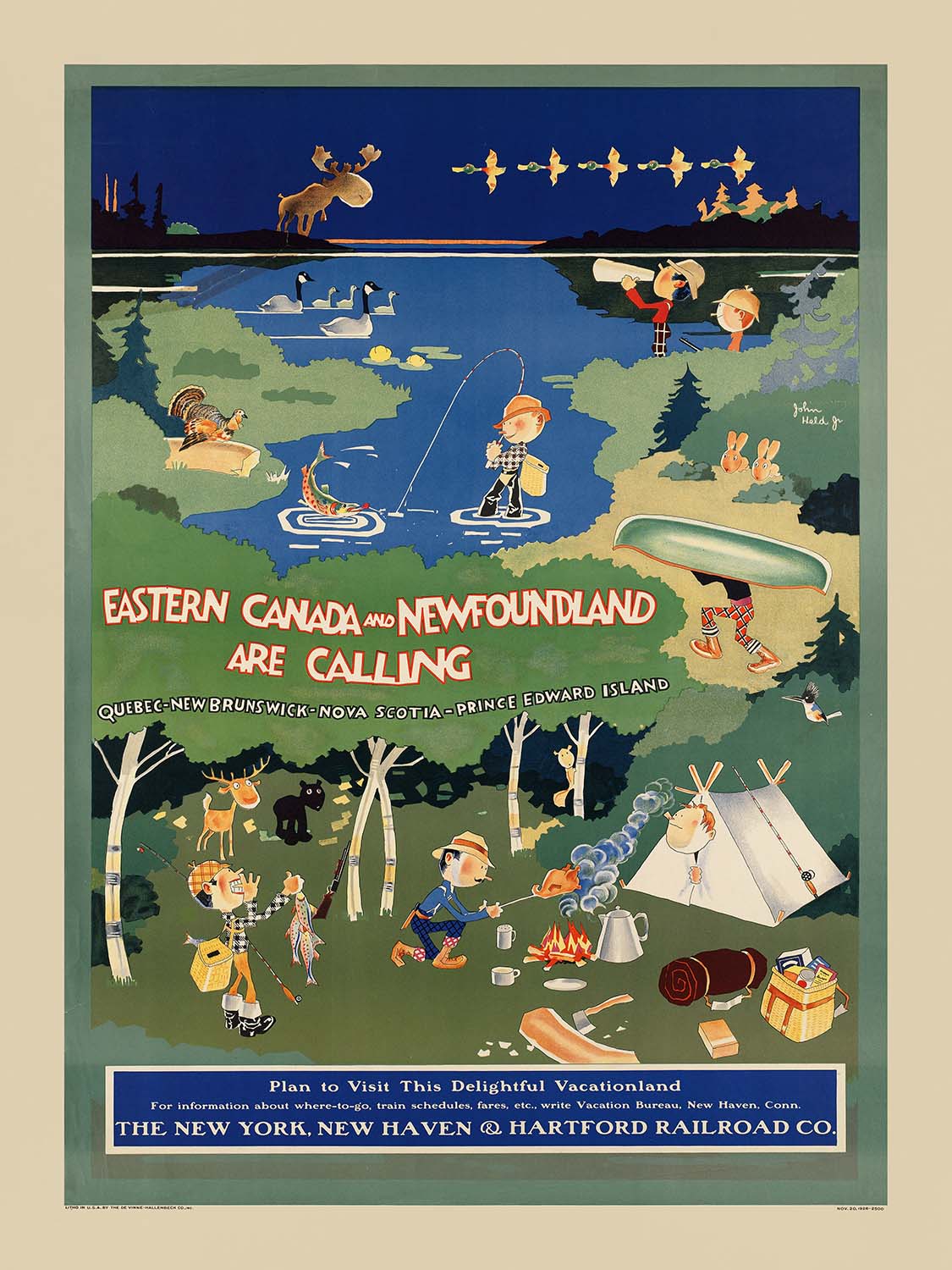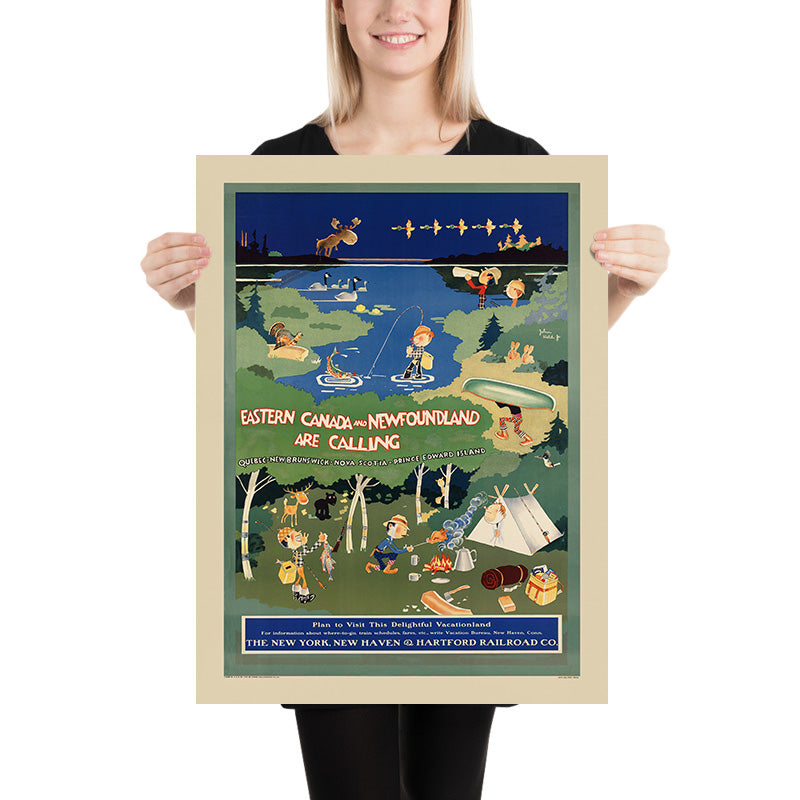 “Eastern Canada and Newfoundland are Calling” by John Held Jr. (1926) is a joyous Jazz Age travel poster inviting New Englanders north to the Canadian Maritimes. Created at the height of the golden era of rail and steamship tourism, it promotes holidays in Québec, New Brunswick, Nova Scotia, Prince Edward Island, and Newfoundland—then still a separate dominion. Held’s playful scene unfurls from a deep-blue lake to a dusky horizon: a fisherman coaxes a red‑spotted trout from the water, a camper tends a crackling fire as smoke curls in cartoon swirls, a canoeist shoulders a gleaming green hull on a portage, and a moose silhouettes against the skyline while Canada geese glide across the water. The hand-lettered headline, in white with bright red shadowing, gives the poster its irresistible call to adventure.
