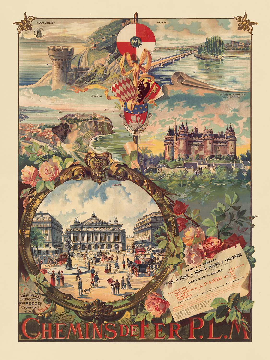 France Travel Poster: Chemins de Fer P.L.M. Lac du Bourget, Genève, Monaco, Château de Pierrefonds by Carlo Cussetti, 1890