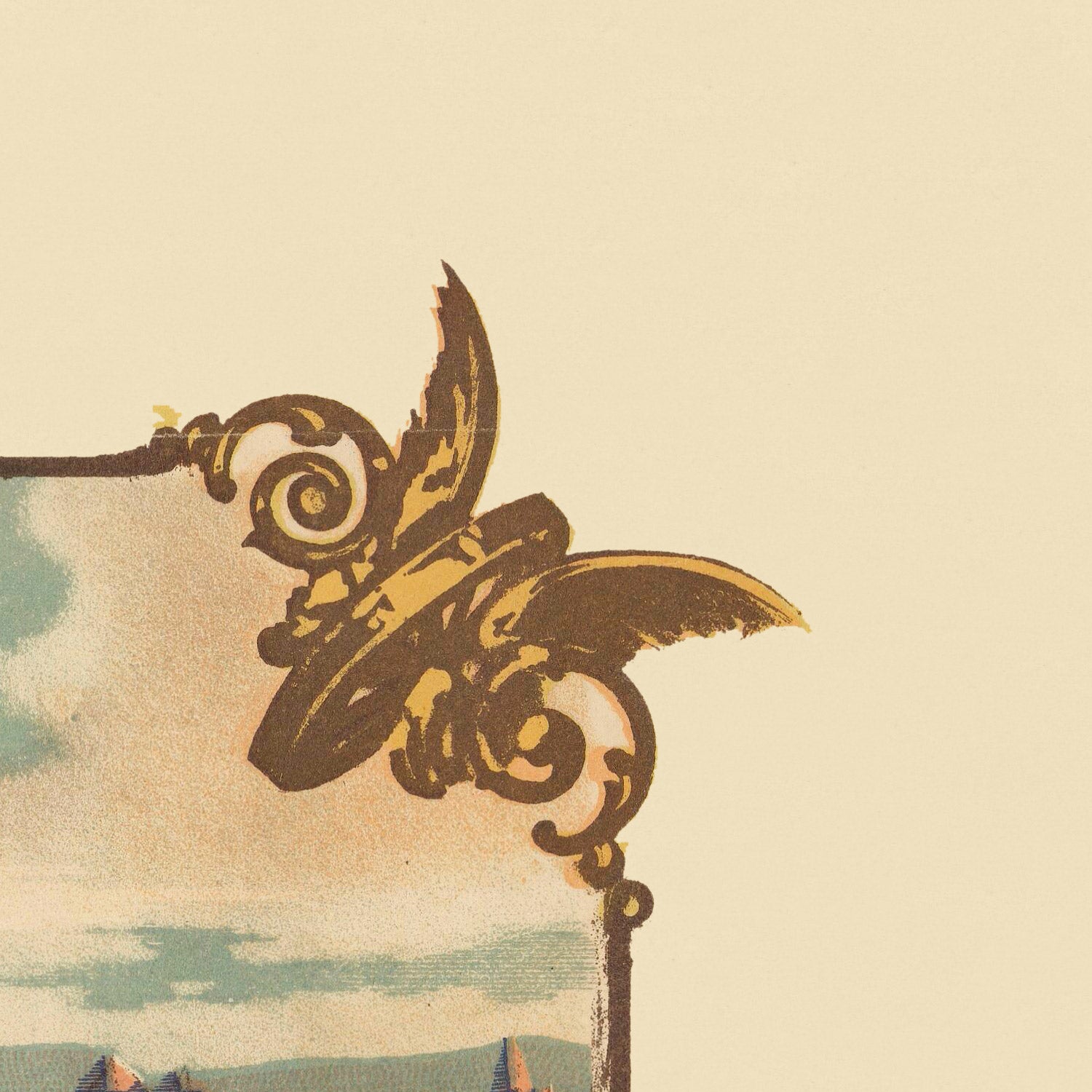 The subject choices in this composition reflect the era’s travel aspirations. Lac du Bourget—France’s largest natural lake—was synonymous with spa culture and lakeside promenades. Genève signaled an alpine gateway with cosmopolitan flair, while Monaco promised Riviera sunshine and grand-hotel glamour. The inclusion of Château de Pierrefonds, a medieval fortress restored in the nineteenth century, nods to the contemporary fascination with history and architecture that made day-excursions and château tours fashionable alongside seaside and mountain resorts.