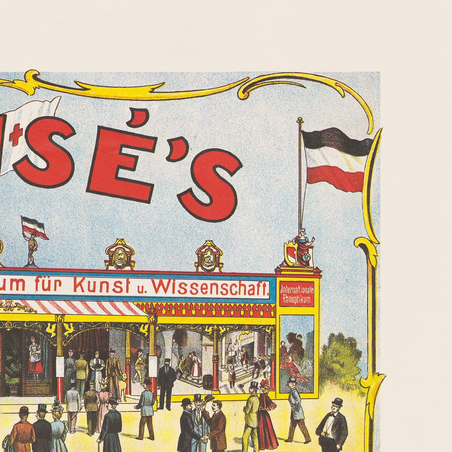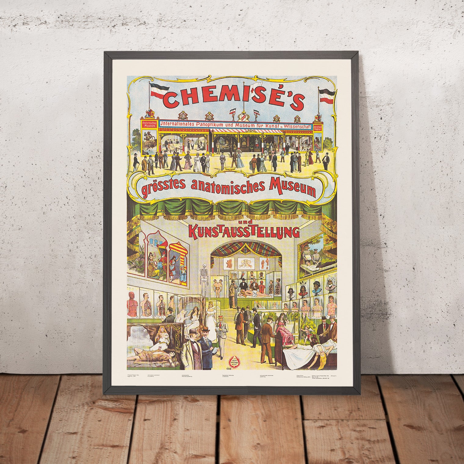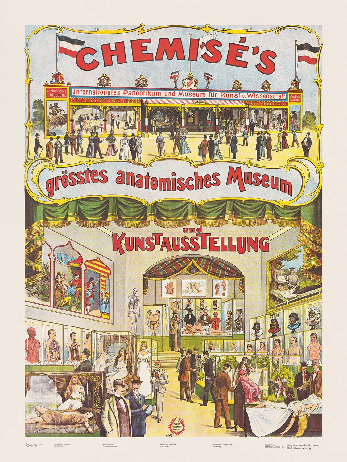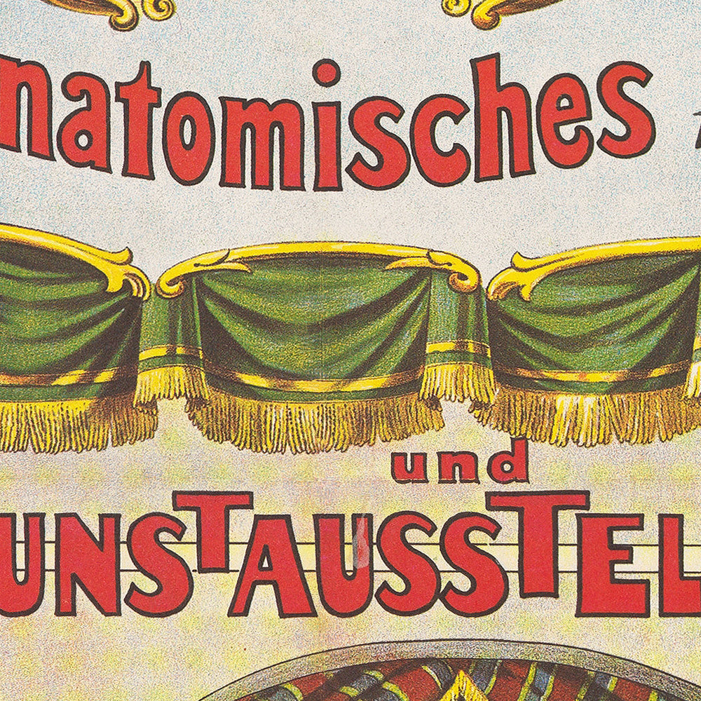 CHEMISE’S, größtes anatomisches Museum und KUNST-AUSSTELLUNG by Adolf Friedländer arrives to us as a remarkable 1880 German travel and entertainment poster—an invitation to a touring “Internationales Panoptikum und Museum für Kunst u. Wissenschaft.” Designed and printed in Hamburg, it captures the late‑19th‑century fascination with science, spectacle, and the grand promenades of European fairgrounds. In the artwork, the scarlet title CHEMISE’S arcs across the sky between fluttering black‑white‑red flags, while a lush green theater curtain unfurls mid‑page to reveal a bustling interior filled with wax figures, anatomical plates, and curious tableaux. This is both a slice of German cultural history and a vivid souvenir for anyone who loves Hamburg or has explored Germany’s historic museum quarters and wintergardens.