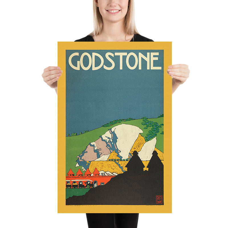 Edward McKnight Kauffer’s Godstone (1915) is a landmark London Underground travel poster that invites city-dwellers into the rolling Surrey countryside. Designed early in Kauffer’s British career, it captures the North Downs in a bold modernist language: a deep blue sky, a sweep of green hills, and a striking white chalk escarpment broken into angular planes of mauve and blue. Across the lower register a rhythm of brick‑red arches and little turrets marches from left to right, while dark, silhouetted rooftops and chimneys anchor the foreground. The large cream “GODSTONE” title sits within a mustard-yellow frame—classic Underground flair. In the fine print along the bottom edge you can see Electric Railway House, Westminster, and the printer Johnson, Riddle & Co., London.
