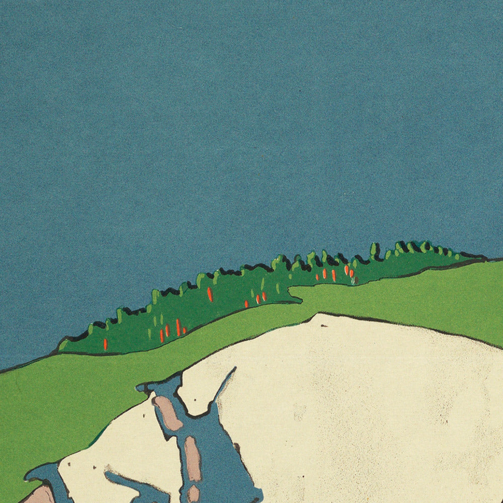 Kauffer’s style here is all about simplifying nature into strong color fields and geometry: the chalk hillside becomes bold shards of white with lavender and slate shadows; the foreground silhouettes create dramatic contrast; the red architectural band provides a lively counterpoint to the cool blues and greens. The palette is both calming and vivid, making the piece a versatile accent for interiors—from minimalist modern to eclectic vintage.
