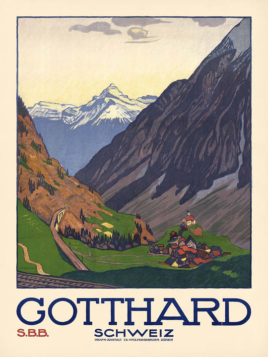 “Gotthard Schweiz” by Emil Cardinaux (1914) captures the drama of the central Swiss Alps at a moment when Europe was falling in love with modern travel. Cardinaux frames the legendary Saint Gotthard region—gateway between northern and southern Switzerland—with sweeping alpine slopes, a serpentine railway, and a cluster of mountain buildings that signal welcome amid grandeur. Created in the early 20th century, this Art Deco–inflected design celebrates the new ease of reaching high places, turning the Gotthard into a symbol of both natural majesty and human ingenuity.