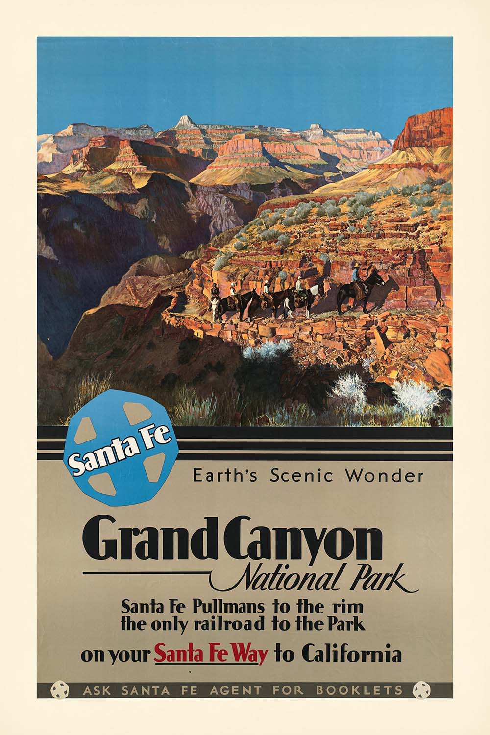 Grand Canyon National Park. Earth’s Scenic Wonder is a classic American travel poster created for the Santa Fe Railway by an anonymous studio artist. The composition captures a mule train threading a cliff‑hugging trail beneath a vast turquoise sky, while stepped mesas fade into cool blues beyond. Issued to entice travelers west, it distills the drama of Arizona’s South Rim into a single sunlit moment and pairs it with bold typography and the famous Santa Fe roundel.