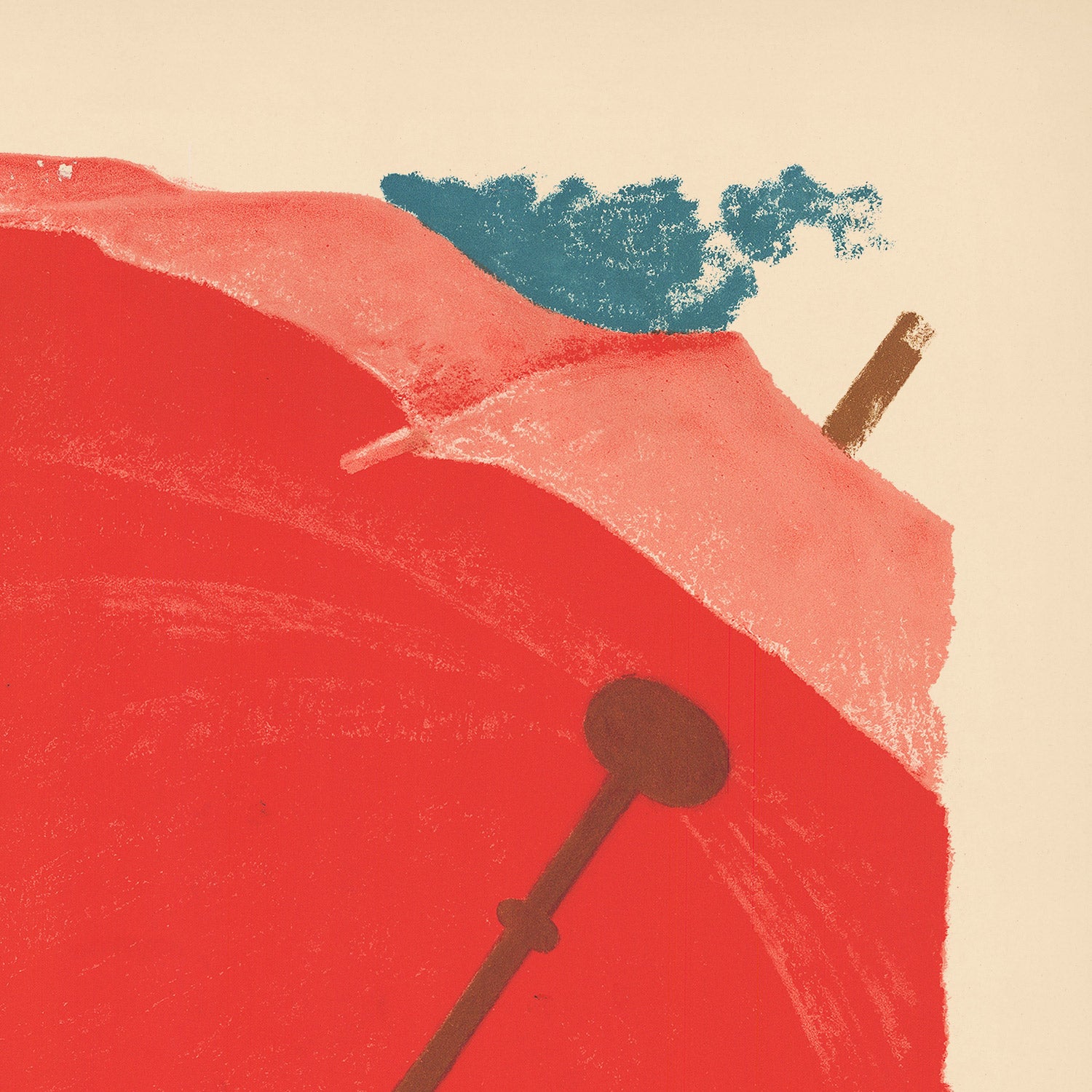 Visually, the design is a masterclass in reduction and color. A dominant field of red fills the canopy, set against saturated greens of pasture and the cool blues of water and distant sky. The diagonal umbrella shaft adds energy and depth, while the scalloped white tips create a playful rhythm along the edge. Printed in rich lithographic textures and grounded by robust sans‑serif lettering, it’s an eye‑catching statement piece that pairs beautifully with modern or classic interiors.