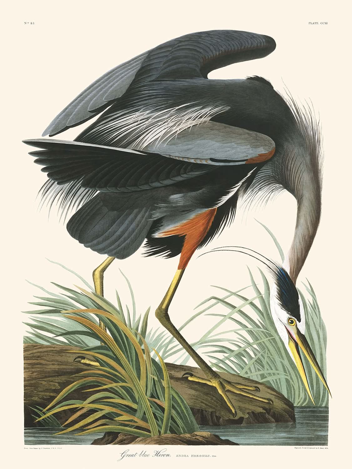 John James Audubon is celebrated for his comprehensive and lifelike portrayals of American birds. His masterpiece, Birds of America, includes 435 hand-colored plates, each offering a detailed exploration of avian life. This particular illustration, notable for its lifelike detail and stunning representation of the Great Blue Heron, highlights Audubon’s dedication to natural artistry and scientific accuracy.