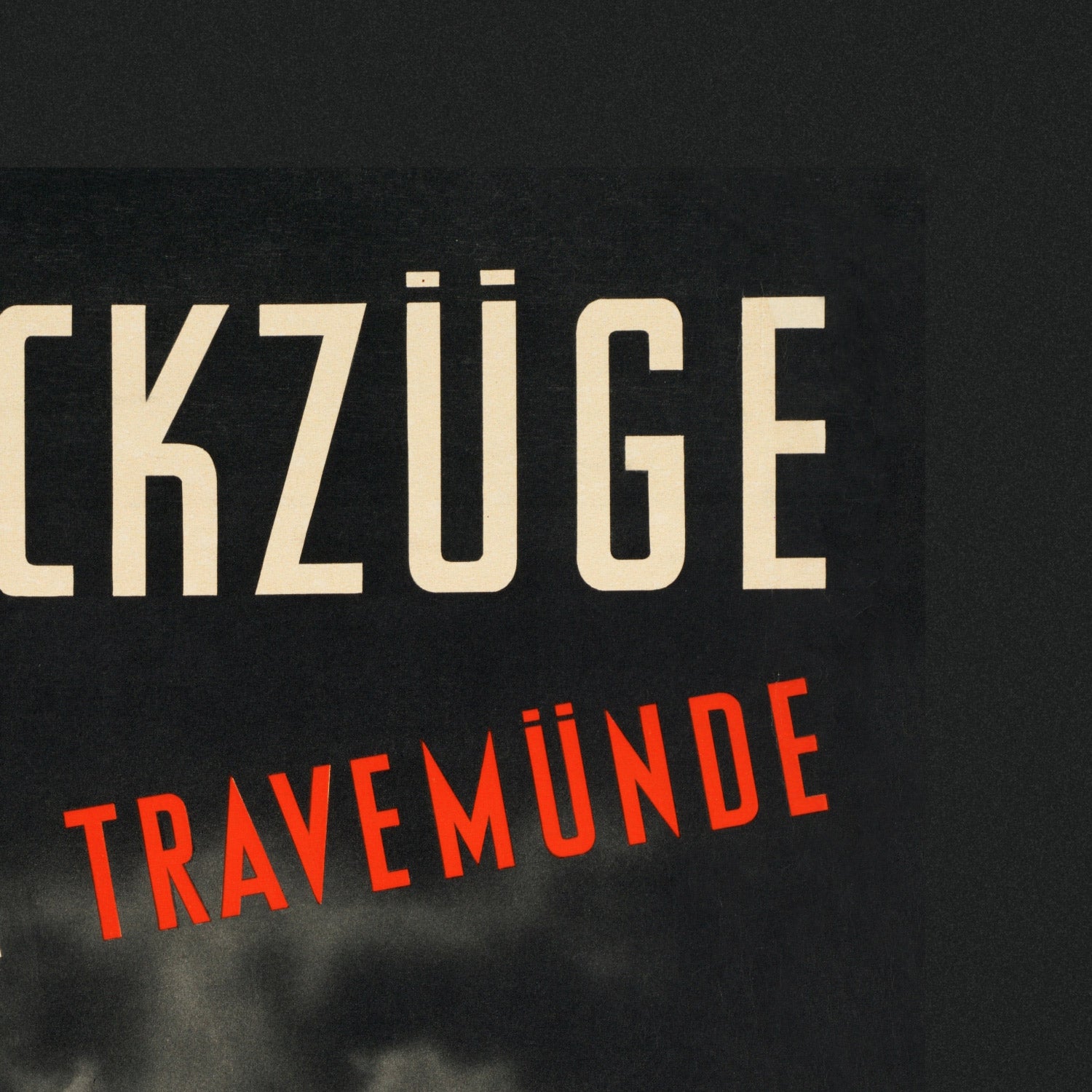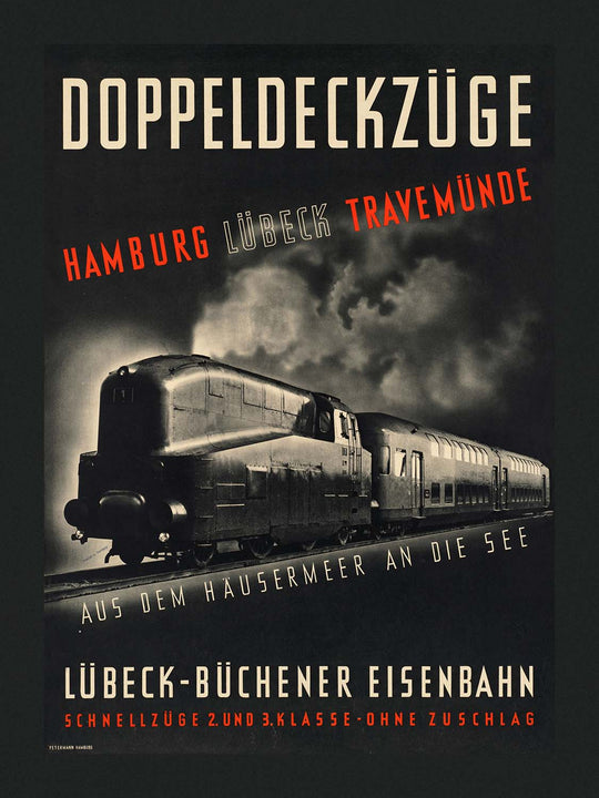 Doppeldeckzüge. Hamburg Lübeck Travemünde. Aus dem Häusermeer an die See by Peter Smith Templeton celebrates the Lübeck–Büchener Eisenbahn’s sleek double‑deck express trains linking Hamburg with Lübeck and the Baltic resort of Travemünde. The poster’s headline DOPPELDECKZÜGE crowns a dramatic, black‑and‑beige night scene: a streamlined locomotive surges forward beneath roiling clouds, while the diagonal red words “Hamburg Lübeck Travemünde” cut across the sky like a streak of speed. The tagline “Aus dem Häusermeer an die See” — literally, “from the sea of houses to the sea” — captures the promise of escape from city streets to open water.