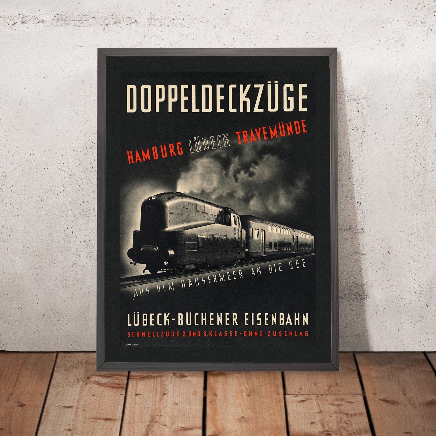 Design and color: the composition is a masterclass in mood and momentum. Black dominates, softened by smoky greys that model the steel skin of the train; cream lettering anchors the layout; and a flash of red brings urgency to the destination list. The low, three‑quarter viewpoint and the slanted subtitle give a cinematic push forward, making this an eye‑catching statement piece for modern, monochrome, or industrial interiors. At the lower left, the discreet “Petermann Hamburg” imprint underscores the poster’s period production values.