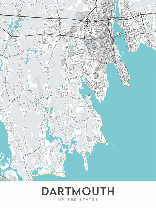 This original creation by The Unique Maps Co. features unique cartography, modern design, and a striking color palette that will complement any home décor. Whether you're a Dartmouth local looking to add a touch of hometown pride to your walls or a traveler who wants to commemorate a memorable visit, this map is sure to impress.