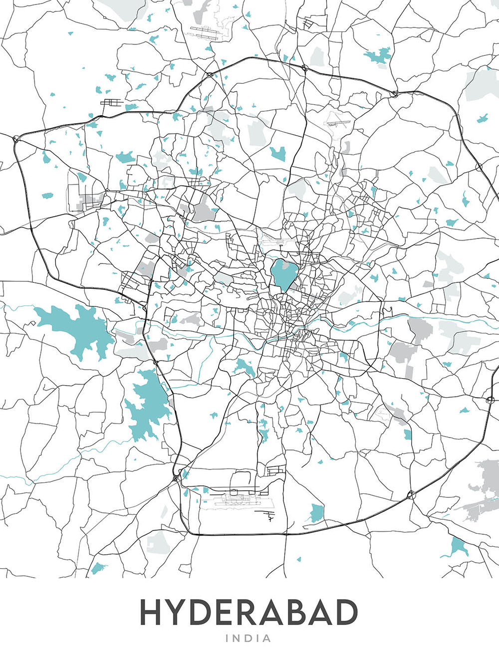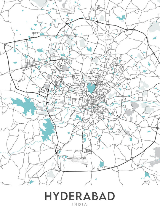 Discover the vibrant heart of Hyderabad with this captivating modern street map created by The Unique Maps Co. in 2024. This map focuses on the dynamic and diverse neighborhoods that make up the city's core, capturing the essence of Hyderabad's bustling urban life. With meticulous detail, this map offers an unlabelled tapestry of the city's streets, showcasing areas such as Banjara Hills, Jubilee Hills, HITEC City, and Gachibowli. It is a visual journey through the city's most iconic residential and commercial districts, presenting a snapshot of Hyderabad's unique urban landscape.