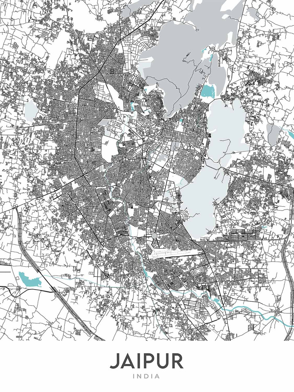The map of Jaipur, created by The Unique Maps Co., presents a stunning, modern interpretation of this vibrant Indian city. This piece captures the intricate network of streets and urban design without the distraction of labels, allowing the viewer to appreciate the organic layout and architectural beauty of Jaipur. Encompassing significant neighborhoods such as Pink City, C-Scheme, and Malviya Nagar, this map serves as a visual symphony of the city's dynamic and ever-evolving landscape. The detailed cartography brings to life the bustling avenues and serene residential areas, offering a unique glimpse into the heart of Jaipur.
