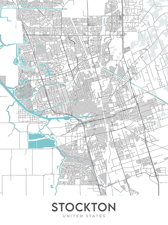 This Stockton map is a modern, detailed street map without labels. It focuses on the city of Stockton in California, and the surrounding areas. The map covers a wide range of neighborhoods, including Downtown Stockton, Lincoln Village, Country Club, Stribley Park, Spanos Park, Weston Ranch, Brookside, Pacific, University Park, El Dorado, Venetian, Quail Lakes, Spanos Park, West Lane, College Park, Van Buskirk, Sierra Vista, Sherwood Manor, and Spanos Park.