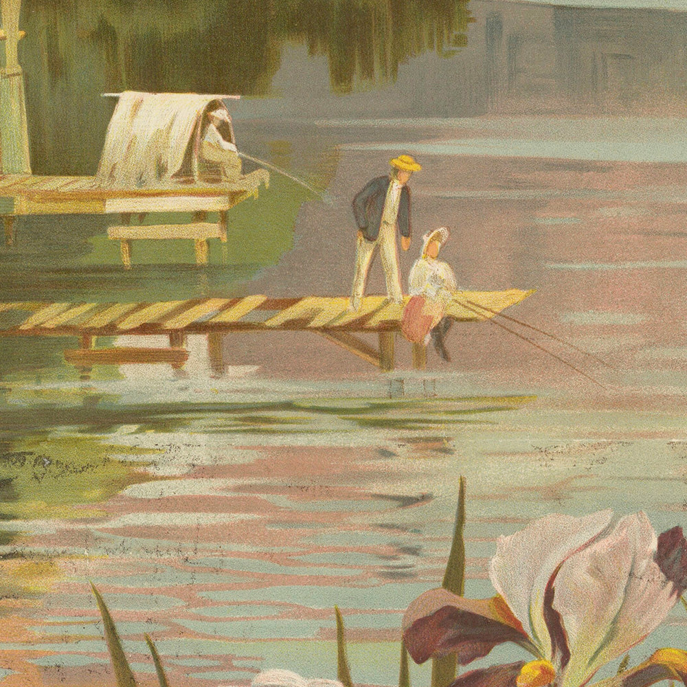 Nantua itself is a jewel of the Jura: a narrow, glacial lake ringed by creamy limestone and dense woodland, long prized for summer bathing, rowing, and scenic walks. Posters like this were the social media of their time—an irresistible invitation to escape the city by train. The PLM network opened these dramatic landscapes to a new leisure class, and d’Alesi’s view captures the moment a traveler steps onto a terrace and the whole amphitheater of lake and cliff unfurls below.