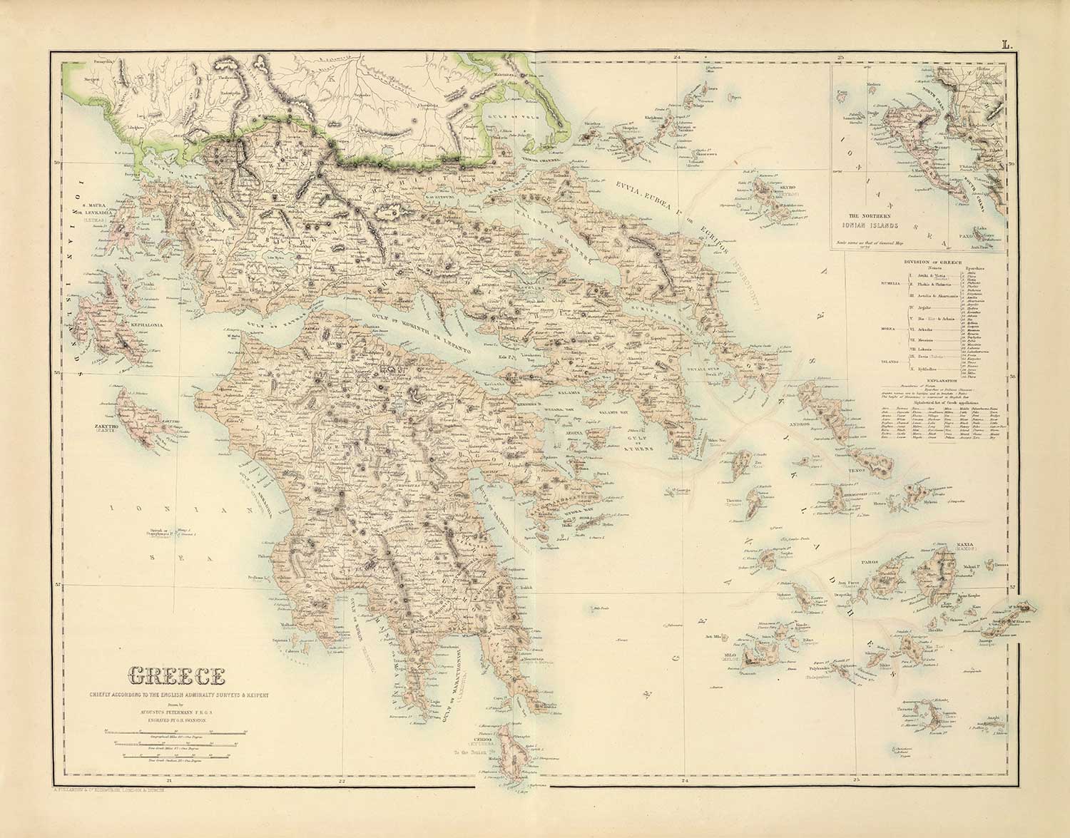 This Victorian masterpiece map of Greece, with its rich original handcolouring, was first published in 1872 by A. Fullarton & Co. in its seminal Royal Illustrated Atlas. The map was engraved by G.H Swanston and is notable for being the last great highly decorative world atlas.