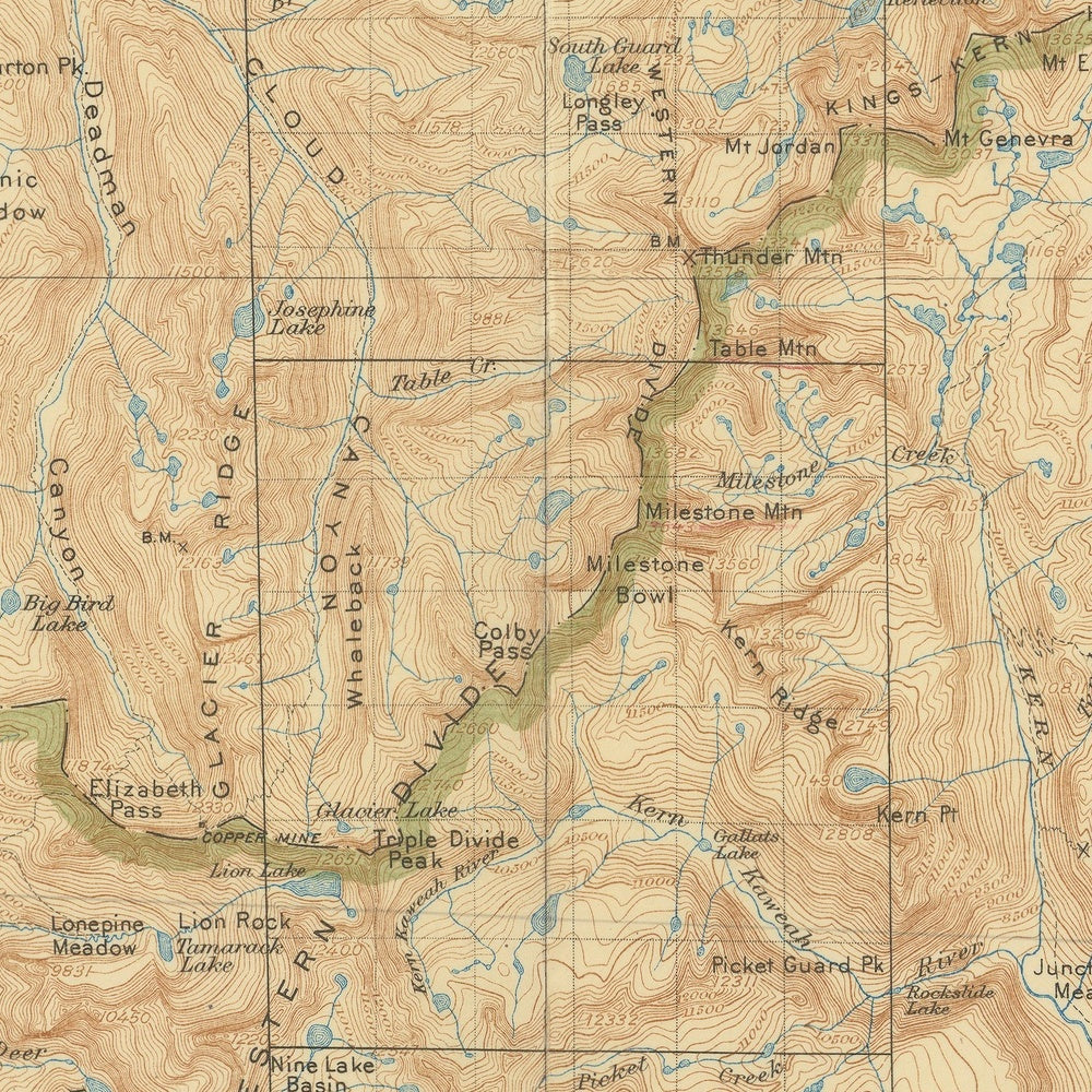 The map’s hydrology and relief are a study in geological time. Glacier-sculpted Kings Canyon is recorded with remarkable clarity, from Cedar Grove’s sheltered floor to the spray of Grizzly Falls. Northward lie Sheep Mountain and the cool oval of Silliman Lake, while to the south the Kern River threads a remote corridor beneath the Divide. Trails and early access roads are traced with care, revealing how visitors of the 1920s first penetrated the high country by automobile and foot. Park boundaries are crisply delineated, a cartographic statement of federal protection at a time when public demand for wilderness recreation was accelerating.