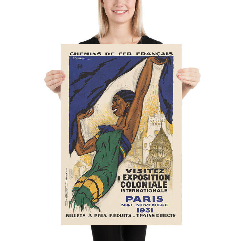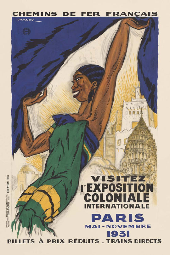 Chemins de Fer Français. Visitez l’Exposition coloniale internationale by Dransy (1931) is a classic French railway poster inviting travelers to the International Colonial Exposition in Paris. The composition surges with motion: a smiling figure lifts a sweeping indigo cloth that arcs across the top of the image, while sketch-like evocations of domes and temple spires suggest the global pavilions of the fair. The typography urges, “Visitez l’Exposition Coloniale Internationale – Paris – Mai–Novembre 1931,” with the railway’s promise of “Billets à prix réduits – Trains directs,” capturing the excitement of interwar travel and spectacle.