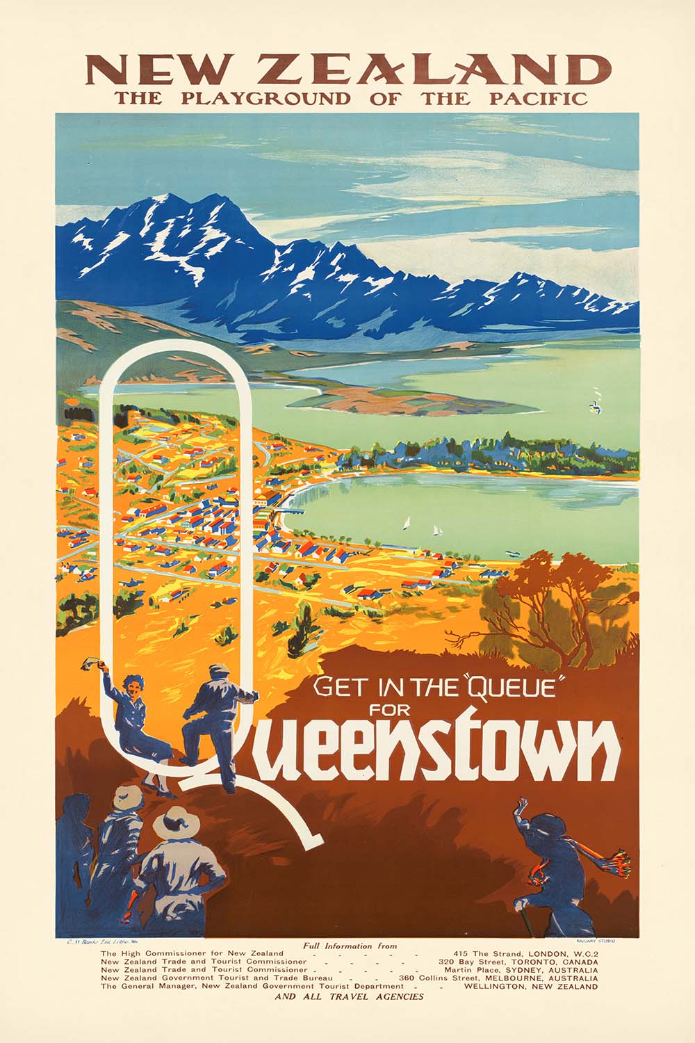“Get in the ‘queue’ for Queenstown. New Zealand, the playground of the Pacific” is a joyous vintage travel poster created for the New Zealand Government Tourist Department by the in‑house Railway Studios in Wellington. Its punning headline wraps the destination in a giant white “Q,” turning typography into a playful invitation, while the view looks across Lake Wakatipu to the snow‑dusted Remarkables. From the tawny, sun‑lit hills to the boats skimming the water and a tiny plane in the distance, the scene captures Queenstown’s promise of fresh air and adventure. At the margin you can even spot period production marks: “RAILWAY STUDIO” at lower right and “C.M. Banks Ltd. Litho, Wn” at lower left.