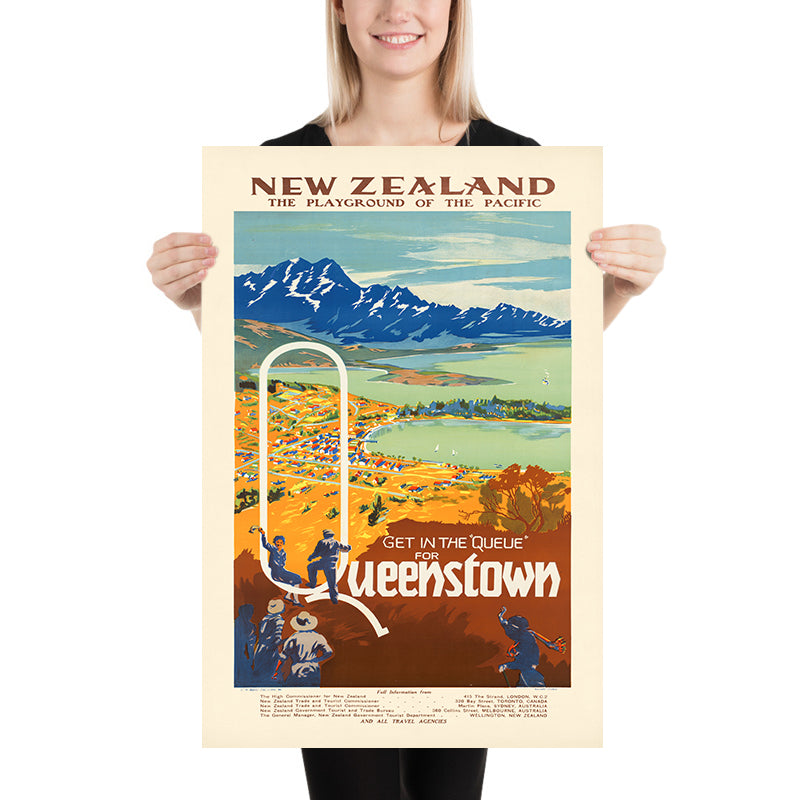 About the subject: Queenstown sits on the shores of Lake Wakatipu in Central Otago, ringed by serrated alpine peaks. Branded in this era as “the playground of the Pacific,” it drew holidaymakers for lake cruises, walking, skiing, and bracing southern air long before it became the modern adventure capital. This poster folds that appeal into a single glance—crowds literally “queueing” to join the fun—making it irresistible wall art for anyone who has stood on the lakeside promenade or watched sunset gild the Remarkables.