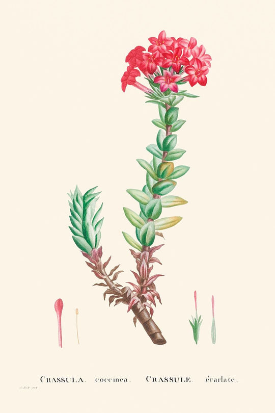 Red Crassula, originally titled "Crassula Coccinea", is an exquisite botanical illustration by the acclaimed artist Pierre-Joseph Redouté, first published in 1802. Known as one of the finest botanical illustrators, Redouté's works have charmed plant enthusiasts and art lovers alike for generations. Born in Belgium, Redouté found early success as a painting tutor to Marie Antoinette, and later embarked on a prolific career immortalizing the floral diversity of Château de Malmaison at the behest of Joséphine Bonaparte, wife of General Napoléon.