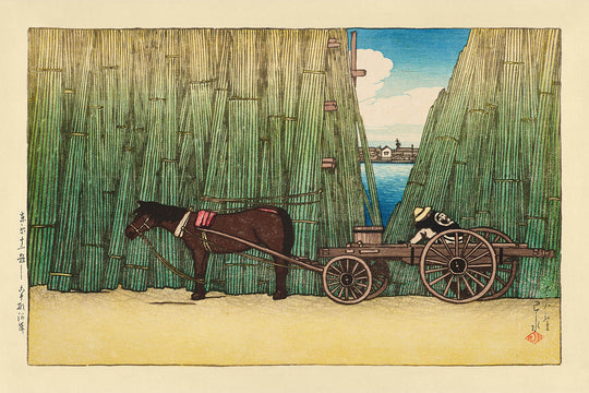 River Bank, Komagata by Hasui Kawase is a breathtaking example of early 20th-century Japanese woodblock printing, created in 1935 and also known by its original Japanese title, Komagata Kashi (駒形河岸). Hasui Kawase, celebrated as one of the leading figures of the shin-hanga (“new prints”) movement, masterfully captured tranquil landscapes across Japan, infusing them with melancholy, light, and beauty. This piece delicately transports viewers to the quiet banks of the Sumida River, where subtle human presence interacts in gentle harmony with verdant nature.