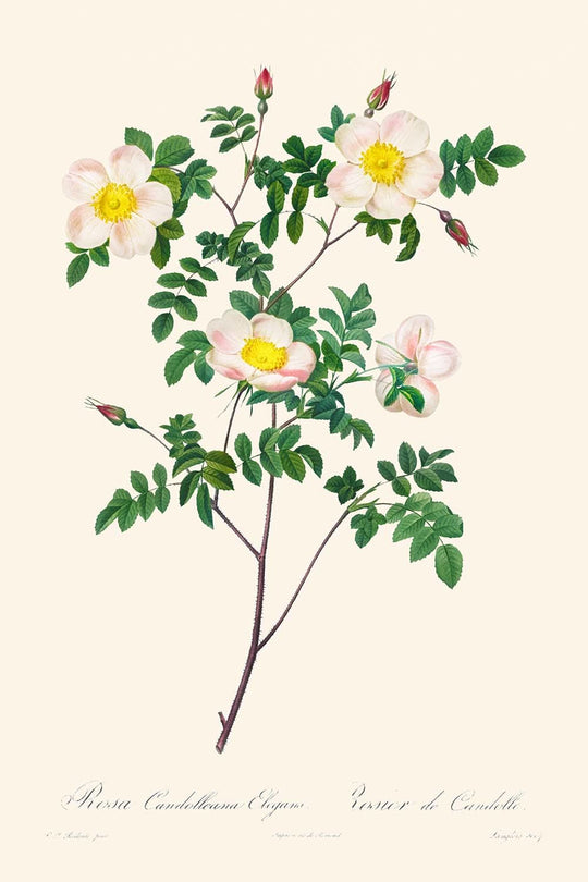 Belgian-born Redouté's connection to royal and aristocratic patronage is woven into the very fabric of his work. The "Rosa Candolleana Elegans" stands as a testament to his meticulous attention to detail and extraordinary talent in capturing the delicate textures and hues of botanical life. The illustration is a symphony of soft blushes and deep greens—a serene composition that marries scientific precision with artistic grace.