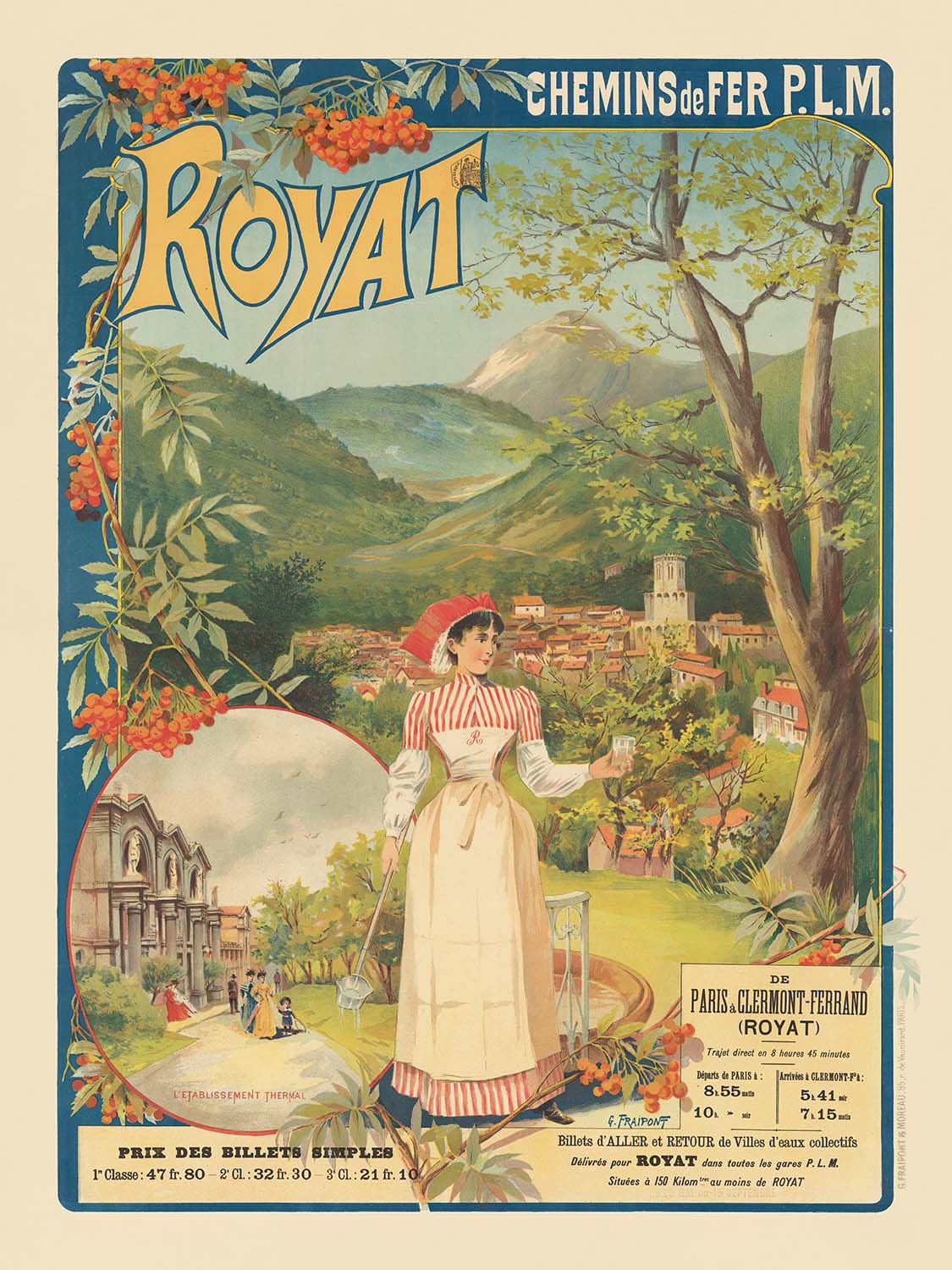 Chemins de Fer P.L.M. Royat, de Paris à Clermont-Ferrand by Gustave Fraipont (1890) captures the Belle Époque allure of Royat, the famed spa resort on the edge of Clermont-Ferrand in France’s Auvergne. Created for the Paris–Lyon–Méditerranée (P.L.M.) railway, the poster invites travelers from Paris to the volcanic uplands of the Puy‑de‑Dôme. Fraipont stages the scene with theatrical clarity: golden “ROYAT” lettering arches across a sky of soft blue, clusters of red berries and fresh green leaves drape the border, and a young woman in a red‑and‑white striped bodice lifts a glass as the tiled roofs and a Romanesque tower nestle in the valley below. A small vignette labeled “L’ÉTABLISSEMENT THERMAL” depicts the baths themselves, while a right-hand panel announces direct service “DE PARIS À CLERMONT‑FERRAND (ROYAT).”