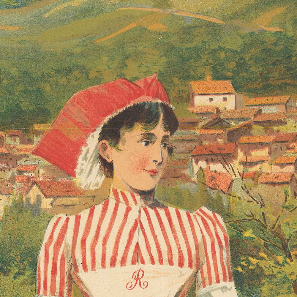 Color and design: Dominated by greens and blues, the composition is punctuated with vibrant reds—the berries that frame the border echo the sitter’s cap and sash, creating a lively rhythm. The lettering, a warm maize yellow keyed with blue shadows, feels sculpted and monumental. Fraipont balances painterly foliage and distant peaks with crisp, blocky typography and a neat timetable cartouche—classic late‑1890s poster craft that reads beautifully across a room. Displayed in a hallway, living room, or study, this print brings the freshness of mountain air and the romance of early rail travel into your home.