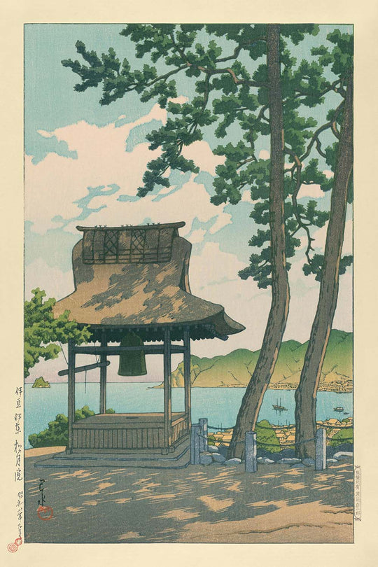 This artwork not only enchants with its picturesque setting but also exemplifies Kawase's adept use of color. Dominant greens merge gracefully with soothing blues, conjuring an atmosphere of stillness and spiritual reflection typical of a Shinto shrine environment. The print’s subtle gradations and intricate detailing invite the viewer to explore a moment of profound tranquility and can bring a similar sense of peace to any space.