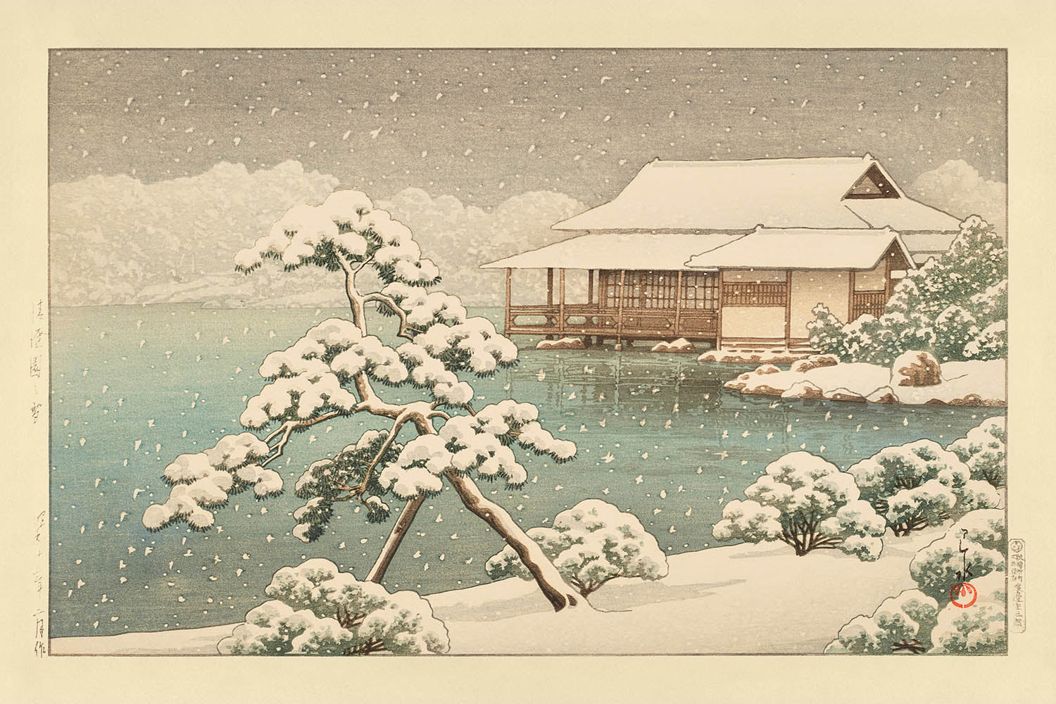 Snow at Kiyosumi Park by Hasui Kawase is a serene Japanese woodblock print, originally titled "Kiyosumi-en no Yuki" (清澄園の雪), crafted in 1935. Hasui Kawase is celebrated as one of the great masters of the shin-hanga ("new prints") movement, whose evocative landscapes captured the poetic charm of early 20th-century Japan. In this enchanting scene, fresh snowfall blankets the grounds and trees of Kiyosumi Park in Tokyo, transporting viewers into a tranquil winter moment, rendered with Kawase’s signature sensitivity to mood and atmosphere.