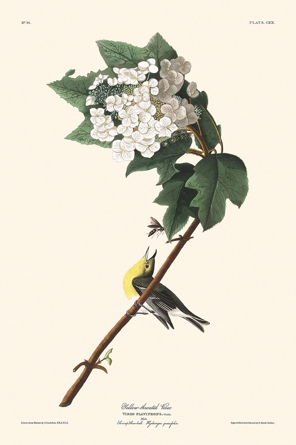 John James Audubon's "Yellow-throated Vireo," originally published in 1827, stands as a captivating illustration from his acclaimed series "Birds of America." This magnificent portrayal captures the unique beauty and behavioral charm of the Yellow-throated Vireo, a bird known for preferring forested environments across the United States. With meticulous accuracy, Audubon brings to life the bird's serene demeanor and distinct markings through his artistry.