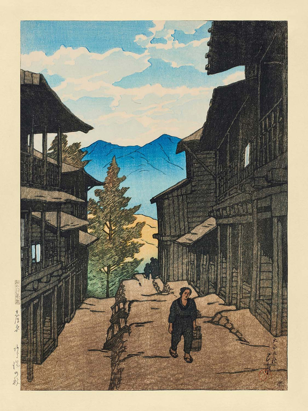 Hasui Kawase (1883–1957) played a pivotal role in revitalizing the art of Japanese woodblock printing with the shin-hanga movement. Known for his atmospheric landscapes and poetic use of light, Kawase's images invite serene contemplation and celebrate impermanence in nature. His signature works often depict tranquil rural scenes, snow-laden rooftops, and shimmering waterways, evoking deep feelings of nostalgia and peace.