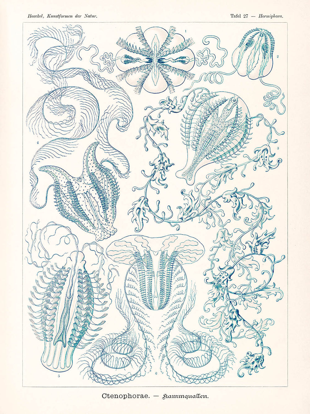 The illustration "Ctenophorae Kammquallen (Tafel 27)" features a variety of "comb jellyfish" or "comb jellies", each depicted with remarkable attention to detail. The vibrant hues of blues, pinks, and yellows showcase Haeckel’s masterful use of color to highlight the delicate beauty and ethereal nature of these marine creatures. The intricate patterns and anatomical precision make this piece not just scientifically valuable, but also a visual treat that would captivate any observer.