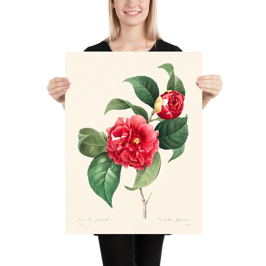 Camelia Japonica, created in 1827 by the renowned botanical artist Pierre-Joseph Redouté, is a captivating example of Victorian botanical illustration. Redouté is celebrated as one of the greatest botanical illustrators of all time, having dedicated much of his career to capturing the flora of Château de Malmaison at the behest of Joséphine Bonaparte, the wife of General Napoléon.
