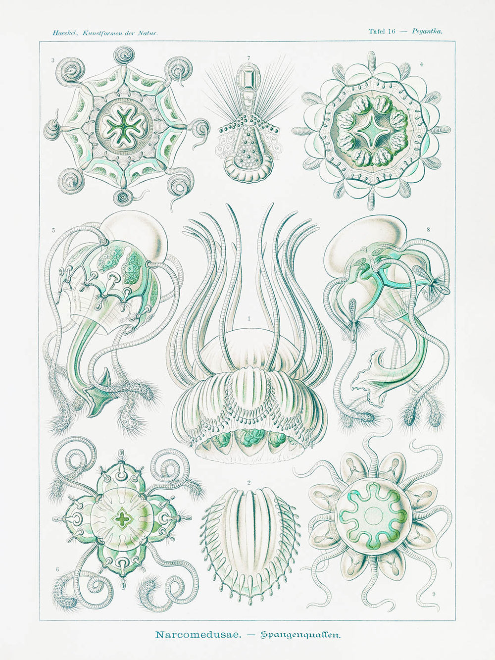 Ernst Haeckel was an accomplished biologist and artist, renowned for his stunning, scientifically accurate depictions of various forms of marine life. His legacy includes the pioneering classification of countless species, and his artwork bridges the gap between science and art beautifully. Narcomedusae Spangenquallen (Tafel 16) is one of his captivating works, showcasing the ethereal beauty of jellyfish with delicate lines and vibrant hues.