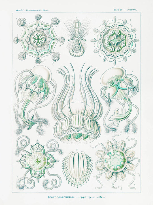 Narcomedusae Spangenquallen (Tafel 16) is a mesmerizing scientific illustration by Ernst Haeckel, originally published in 1904 as part of his illustrious "Kunstformen der Natur". This particular artwork showcases various species of jellyfish intricately detailed, reflecting Haeckel's profound admiration for the natural world.