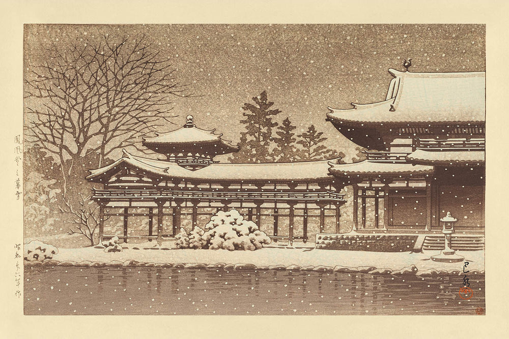 Experience the serene beauty and delicate craftsmanship of "Evening Snow at Byodoin Temple (Phoenix Hall)" by the renowned Japanese woodblock print artist Hasui Kawase. Created in 1935 during the Shin-Hanga movement, this woodblock print exemplifies Kawase's expertise in blending traditional ukiyo-e techniques with Western aesthetic influences to capture the tranquil elegance of Japanese landscapes, particularly known for their reflective and ethereal qualities.