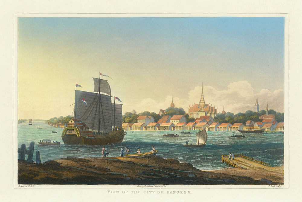 First View of Bangkok by Henry Colburn is a truly historic perspective, capturing the earliest printed view of the city as seen from the Chao Phraya River in 1828. This evocative antique aquatint was based on in-person sketches taken during John Crawfurd’s diplomatic mission to the royal courts of Siam in the early 1820s. With exquisite attention to both architectural form and the vibrancy of the riverside life, the artwork transports viewers to the heart of old Bangkok, gazing across the water to what is now the bustling Chinatown area.