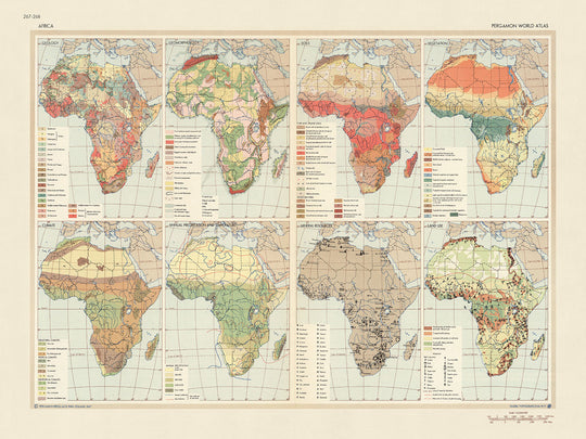 The map is remarkable for its eight separate yet interconnected infographics, each shedding light on a different aspect of Africa's geography. These infographics cover a wide range of topics, from geology and geomorphology to soils, vegetation, and climate. Each infographic is meticulously detailed, providing a wealth of information that allows the viewer to gain a deep understanding of Africa's diverse geographical features. The infographics on annual precipitation and temperature are particularly noteworthy, offering a fascinating glimpse into Africa's varied climate.