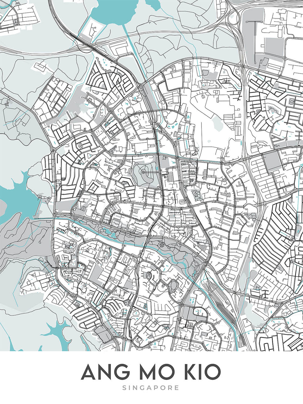 Ang Mo Kio, a vibrant and bustling neighborhood nestled in the heart of Singapore, is brilliantly captured in this contemporary map by The Unique Maps Co. This map focuses on the intricacies of Ang Mo Kio's street layout and public spaces, offering a clean, unlabelled aesthetic that emphasizes the modern urban landscape. The region is famed for its harmonious blend of residential zones, commercial hubs, and lush green spaces, making it a fascinating subject for a decorative map. The lack of labels invites viewers to explore the visual textures and patterns formed by the roads and landmarks, turning a simple map into an intriguing visual puzzle of one of Singapore’s most beloved neighborhoods.