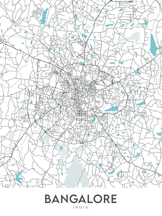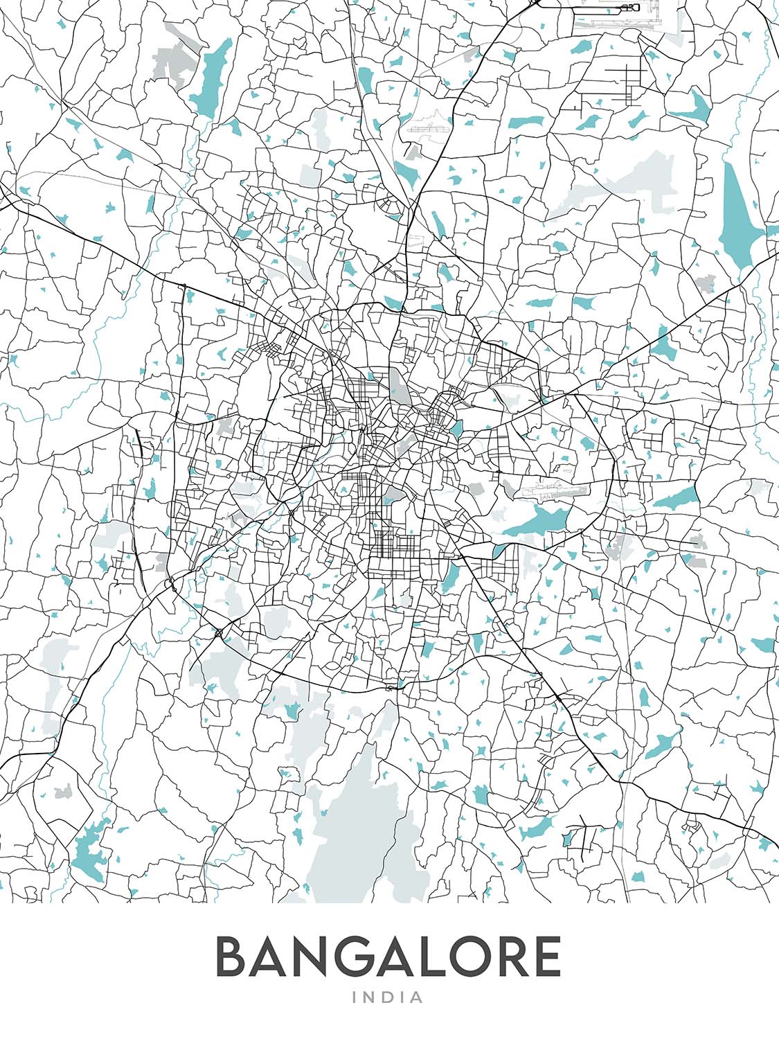 In addition to its visual appeal, this map also serves as a tribute to Bangalore's rich cultural and geographical landscape. Iconic landmarks such as Lalbagh Botanical Garden, Cubbon Park, and Bangalore Palace are subtly represented, providing a sense of place and history without overwhelming the viewer. The map also includes significant bodies of water like Ulsoor Lake, adding a natural element to the urban environment. These features make the map not only a beautiful piece of art but also a meaningful one, capturing the essence of Bangalore in a unique and stylish way.