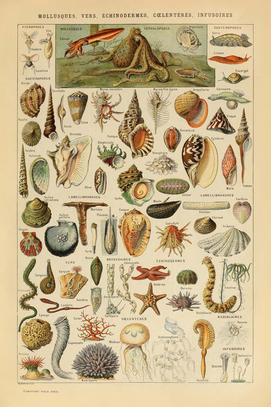 "Molluscs" is a captivating Victorian zoological illustration by Adolphe Millot, first published in 1890 in the esteemed French encyclopedia "Le Larousse pour tous: nouveau dictionnaire encyclopédique." Millot, a renowned painter, lithographer, and entomologist, was highly influential in the visual documentation of natural history in the 19th century. The illustration before you is both beautifully rendered and scientifically rigorous, offering a fascinating glimpse into the diversity of marine life as it was understood in the Victorian era.